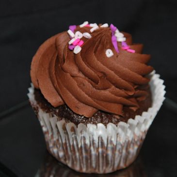 Chocolate cupcake filled with chocolate custard. Topped with chocolate buttercream icing and chocolate sprinkles