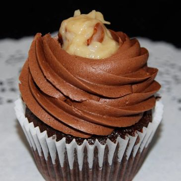 Chocolate cupcake filled with custard, coconut and pecans. Topped with chocolate buttercream and more yummy custard