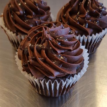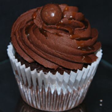 A chocolate cupcake filled with caramel. Topped with chocolate icing, caramel drizzle and a chocolate caramel ball on top