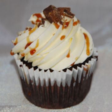 A chocolate cupcake baked with toffee bits. Topped with vanilla buttercream, caramel drizzle and skor bits on top