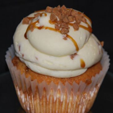 A vanilla cupcake baked with toffee pieces. Topped with a vanilla buttercream icing filled with toffee pieces, a caramel drizzle and more toffee pieces on top.