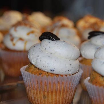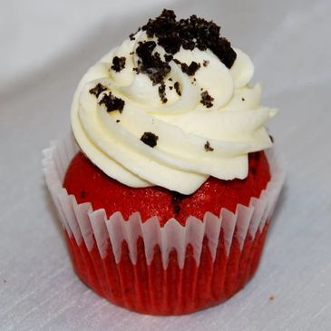 A red velvet cupcake baked with orea cookies. Topped with cream cheese icing and cookie crumbs