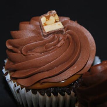 A chocolate cupcake filled with dulce de leche. Topped with dulce de leche, chocolate buttercream icing and a piece of mars bar on top