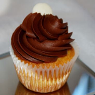 A vanilla cupcake filled with custard. Topped with fudge buttercream.