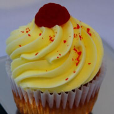 A lemon cupcake filled with Raspberry. Topped with lemon buttercream icing.