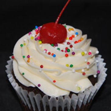 A chocolate cupcake filled with chocolate fudge. Topped with vanilla buttercream icing, chocolate drizzle, sprinkles and a cherry on top