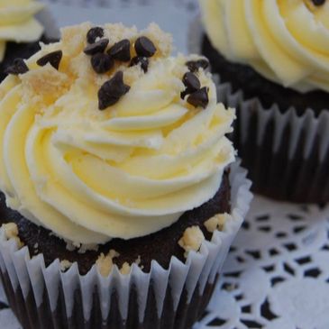 A chocolate cupcake filled with cookie doh. Topped with vanilla buttercream and more cookie doh!