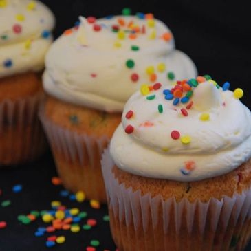 A vanilla cupcake baked with fun colors. Topper with vanilla buttercream icing and more sprinkles on top.