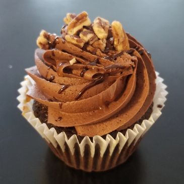 Chocolate cupcake filled with caramel. Topped with chocolate buttercream icing, drizzles and pecans